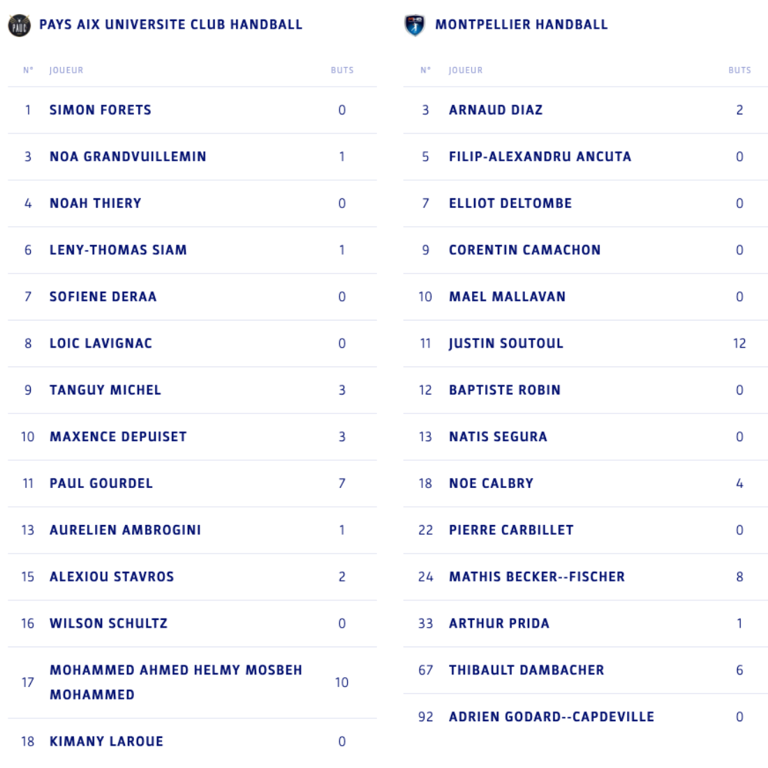 La défense montpelliéraine autour de Calbry/Prida/Becker/Dambacher prend la mesure des attaquants aixois, Godart est présent dans les buts et les ailes du MHB en profitent pour scorer dans les dix dernières minutes : trois arrêts, trois buts de Soutoul et un de Diaz. Ce gros temp fort permet aux visiteurs d’atteindre la pause avec sept buts d’avance : 15-8. Les cadres continuent de répondre présents en début de seconde et l’écart de sept buts se maintient (13-20, 40e).