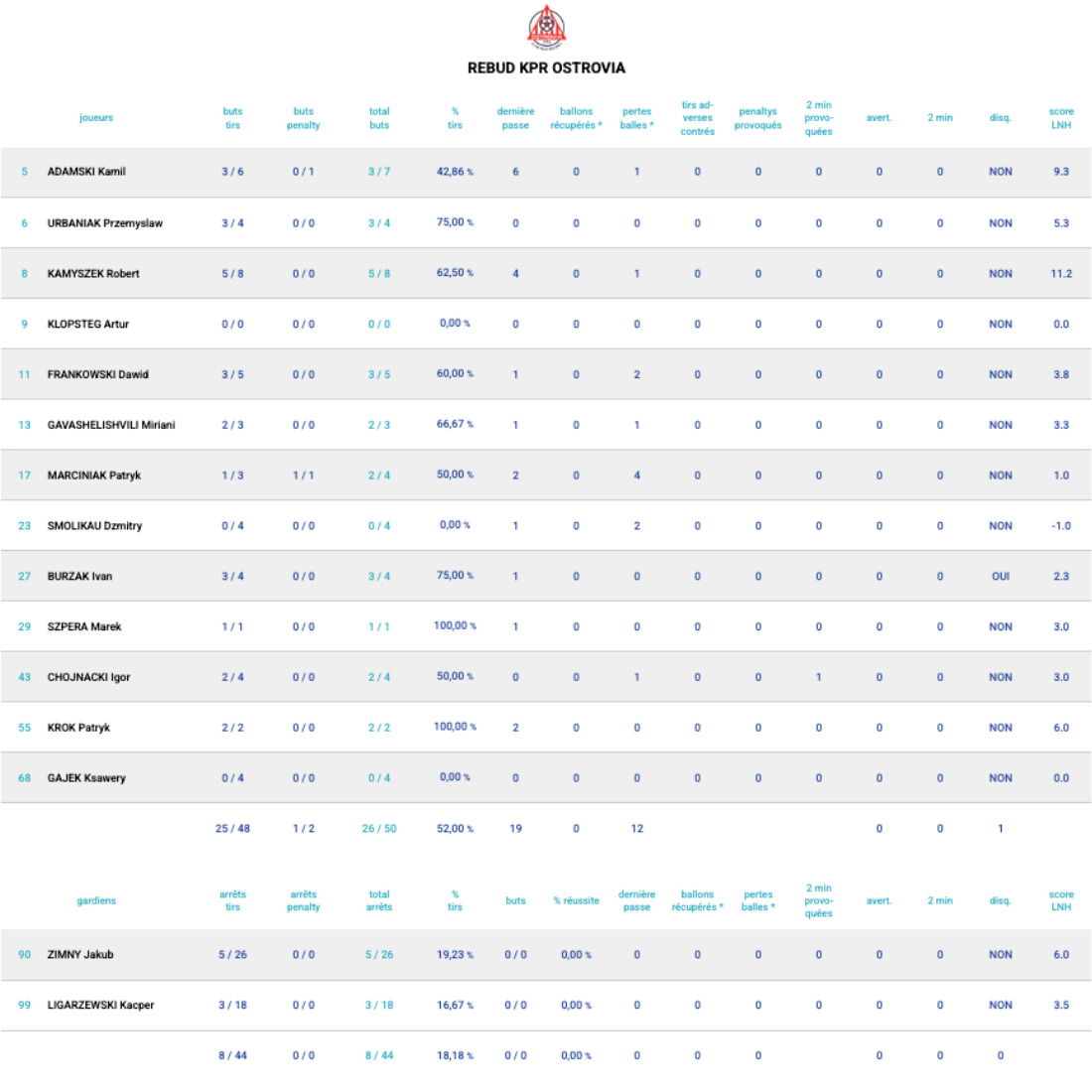 Les statistiques d'Ostrovia